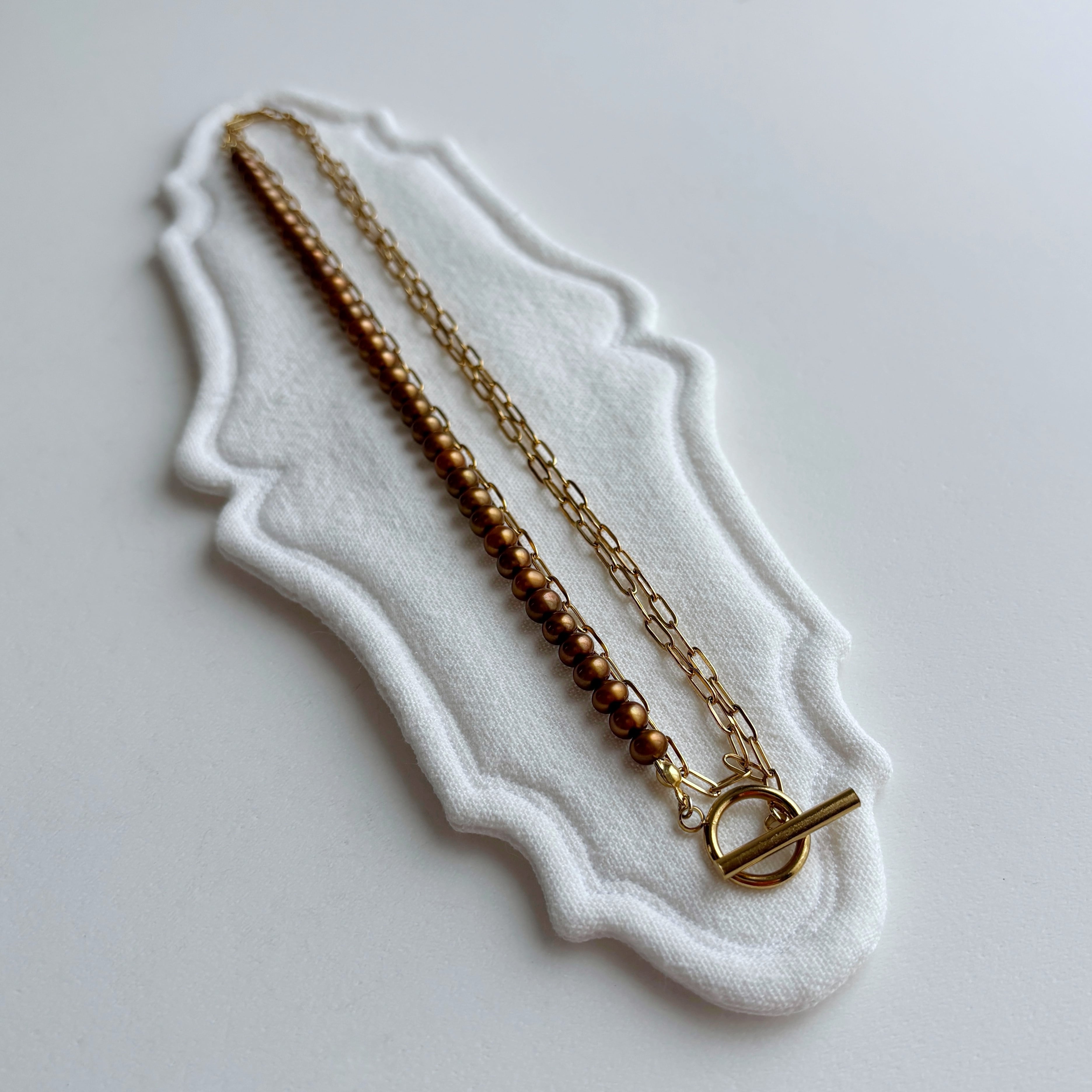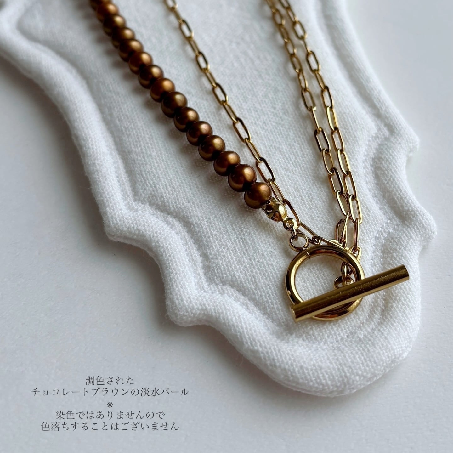 long necklace/chocolate gold pearl and square chain アレルギー対応